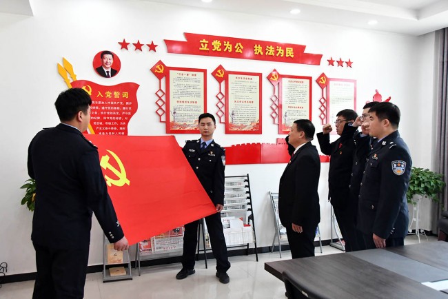 2月9日,虞城县人民法院举行新发展预备党员宣誓仪式,新发展预备党员侯庆伟、荣航正、赵硕三人参加宣誓。